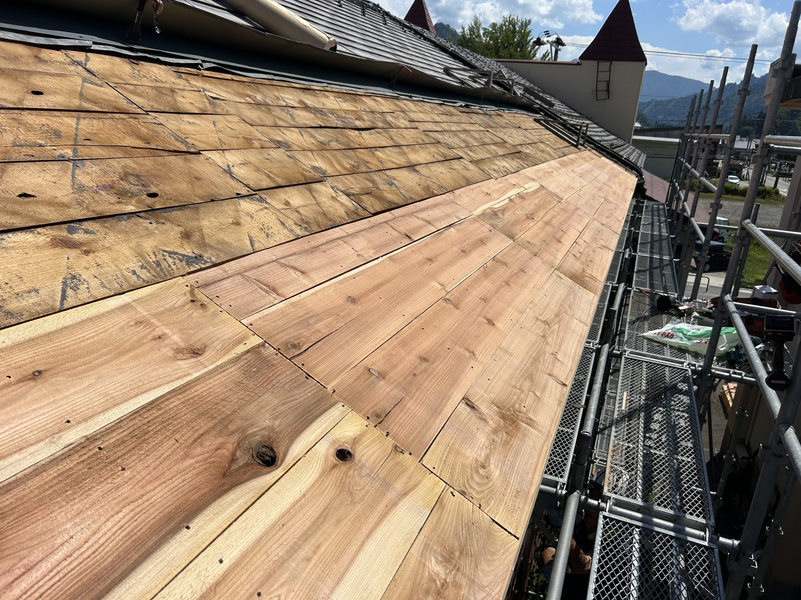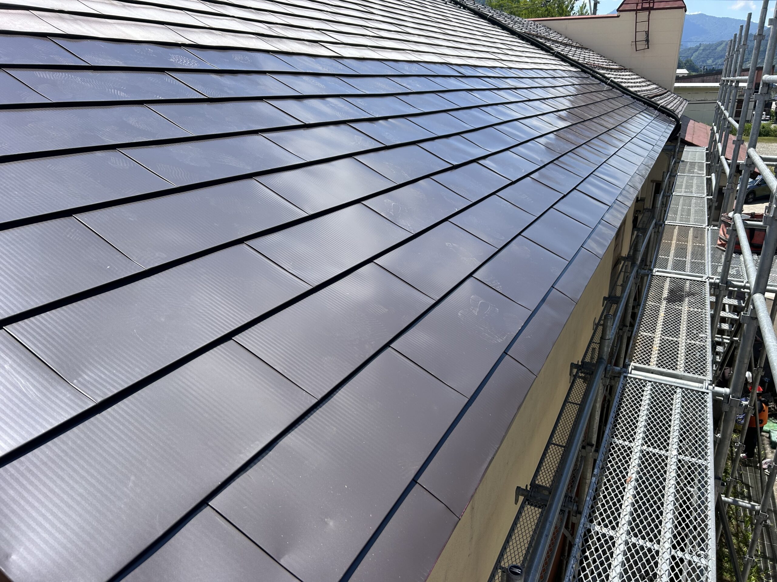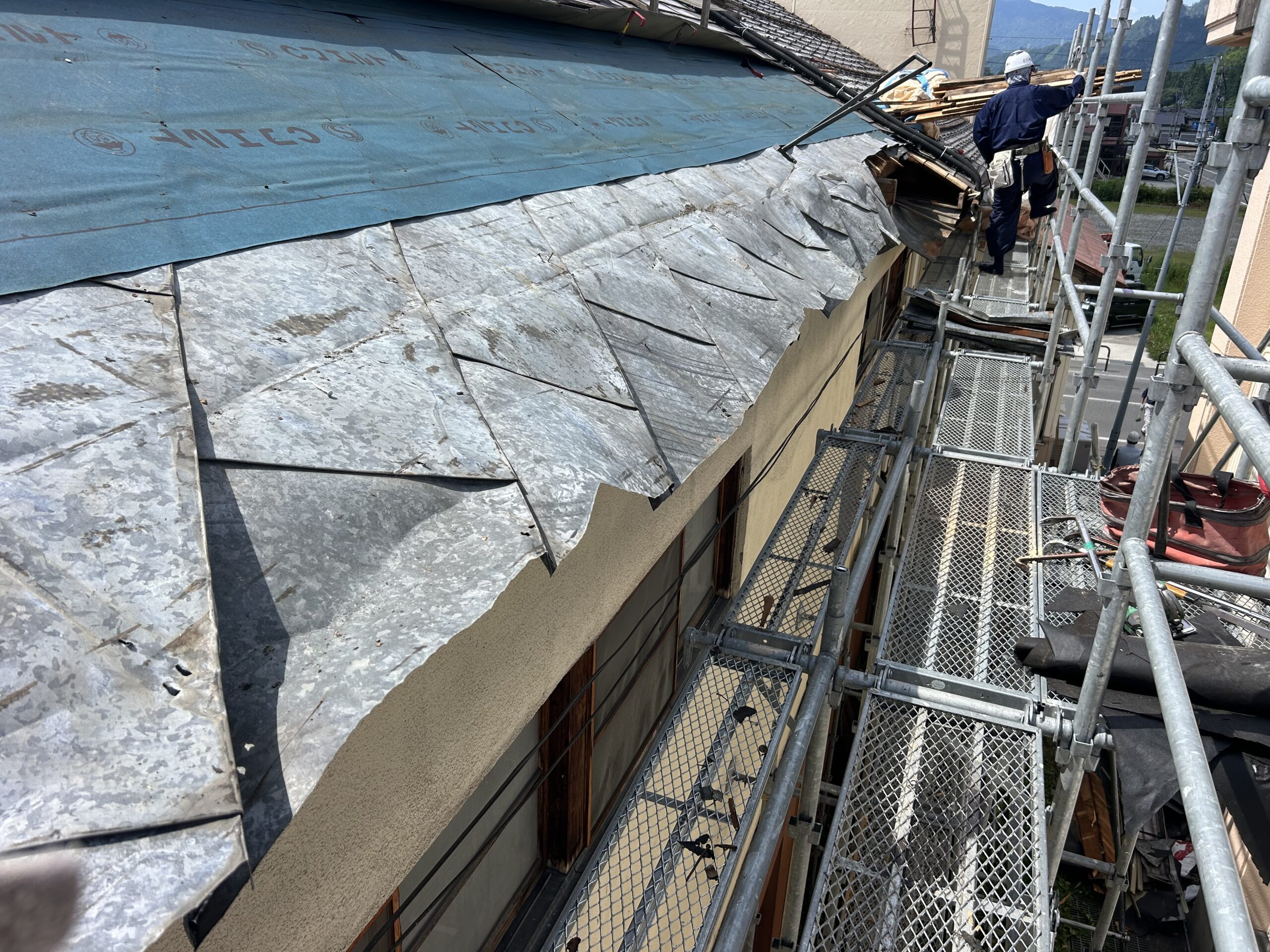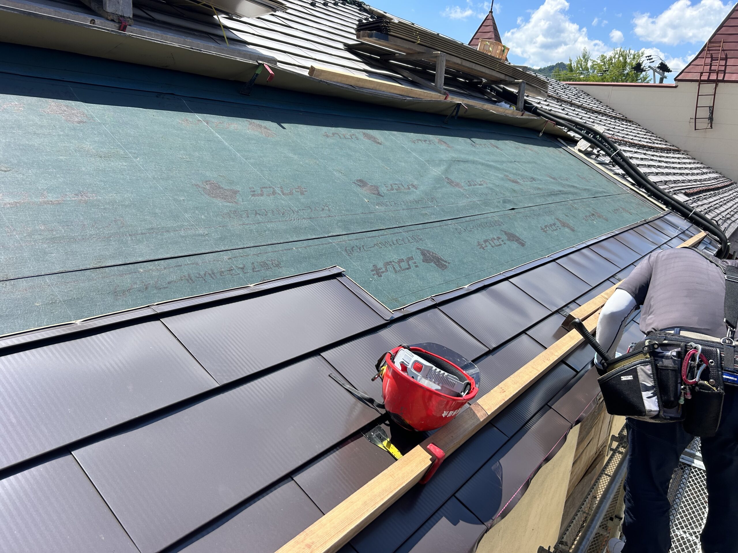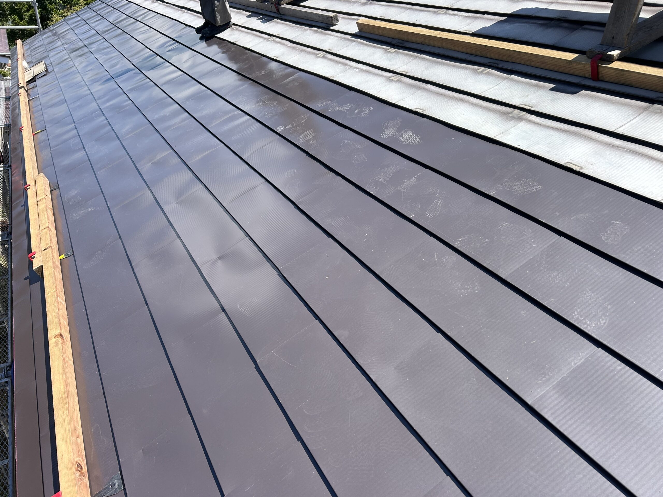 既存の屋根材と繋いで、屋根足場も撤去して